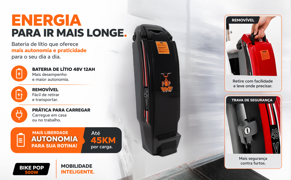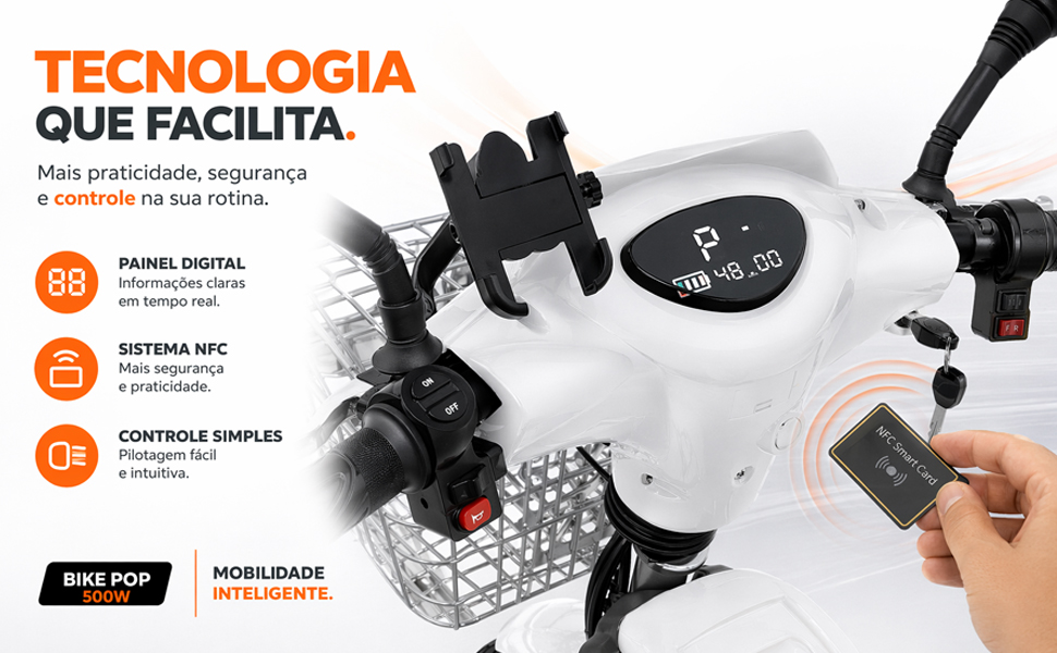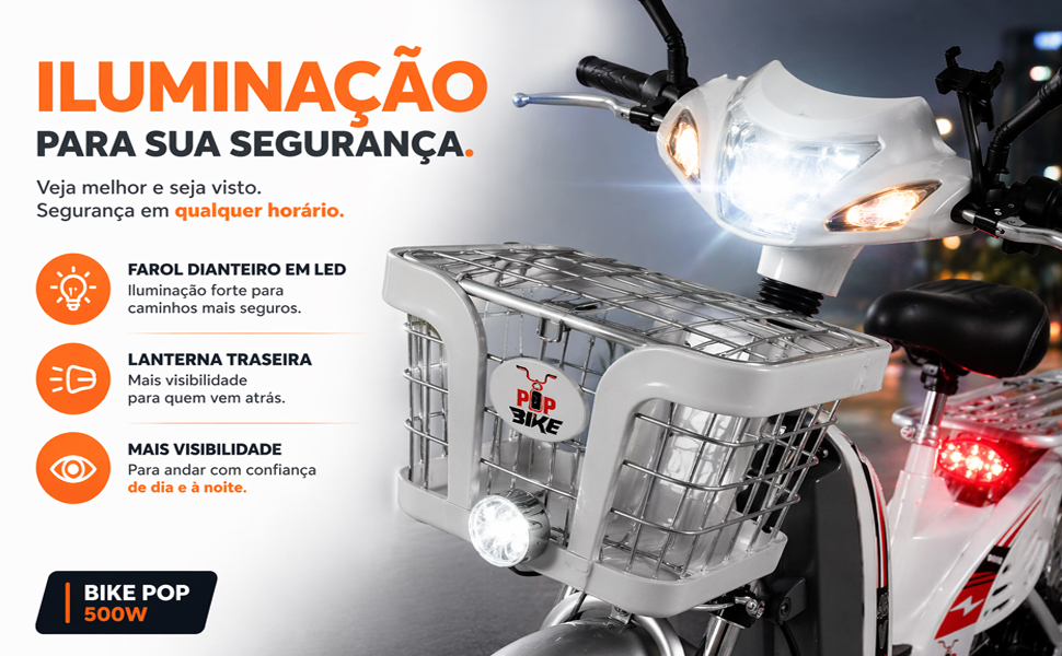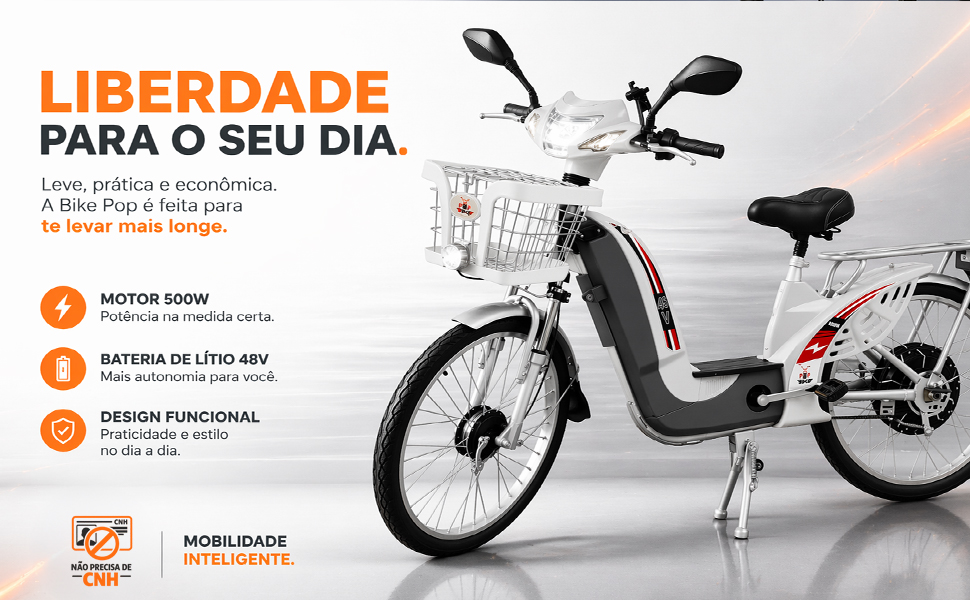 A Bike Pop 500W é a escolha ideal para quem busca praticidade, economia e mobilidade no dia a dia. Com bateria de lítio removível, excelente autonomia e recursos modernos, ela transforma seus deslocamentos em algo mais ágil, confortável e sem esforço.